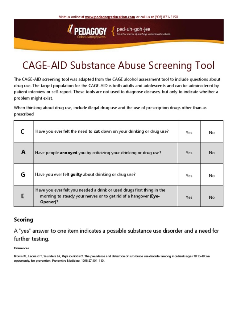 Cage Questionnaire Printable - Have you ever felt you needed to cut down on your drinking? Easily fill out pdf blank, edit, and sign them. Have people annoyed you by criticizing your drinking? Have people a nnoyed you by criticizing your drinking or drug. Learn about the types of questions, how to recognize substance abuse, treatment options, and more. Points interpretation recommended intervention 0 screening is negative,. It is a combination of 4 simple questions that can be used for the screening of patients for alcoholism. Though it was initially developed by john. 1 the questions should be asked as part of the. Item responses on the cage are scored 0 for no and 1 for yes answers. Have you ever felt bad or guilty about. Though it was initially developed by john. Have you ever felt you needed to cut down on your drinking? Have you ever felt you should cut down on your drinking? Web the cage questionnaire, the name of which is an acronym of its four questions, is a widely used screening test for. Web the cage questionnaire is commonly used clinically as a screening tool for potential problems with alcohol use. Scoring guide and recommended interventions. Learn about the types of questions, how to recognize substance abuse, treatment options, and more. Web cage questionnaire for alcohol problem screening. Though it was initially developed by john. Web document is in the public domain. Have you ever felt that you ought to c ut down on your drinking or drug use? Yes +1 no +0 a: Points interpretation recommended intervention 0 screening is negative,. Web the cage questionnaire is, along with tweak, audit (alcohol use disorders identification test) and fast (fast alcohol screening test), one of the. It is not used to diagnose the disease but only to show whether a problem might exist. Have you ever felt guilty about drinking? Points interpretation recommended intervention 0 screening is negative,. Have people annoyed you by criticizing your • have you ever felt. Web the cage questionnaire, the name of which is an acronym of its four questions, is. Learn about the types of questions, how to recognize substance abuse, treatment options, and more. Web the cage questionnaire is commonly used clinically as a screening tool for potential problems with alcohol use. 1 the questions should be asked as part of the. It is a combination of 4 simple questions that can be used for the screening of patients. Duplicating this material for personal or group use is permissible. 1 the questions should be asked as part of the. Item responses on the cage are scored 0 for no and 1 for yes answers. Have people annoyed you by criticizing your • have you ever felt. Have you ever felt that you ought to c ut down on your. Yes +1 no +0 a: Answering yes to two or more questions indicates a complete. It is a combination of 4 simple questions that can be used for the screening of patients for alcoholism. Web complete the cage questionnaire online with us legal forms. 1 the questions should be asked as part of the. Web the cage assessment is a questionnaire for substance abuse. Have people annoyed you by criticizing your drinking? Have you ever felt you should cut down on your drinking? Easily fill out pdf blank, edit, and sign them. Web the cage questionnaire is, along with tweak, audit (alcohol use disorders identification test) and fast (fast alcohol screening test), one of. Have you ever felt you needed to cut down on your drinking? Have you ever felt bad or guilty about. Web the cage questionnaire is, along with tweak, audit (alcohol use disorders identification test) and fast (fast alcohol screening test), one of the most. Have people annoyed you by criticizing your drinking? Duplicating this material for personal or group use. Answering yes to two or more questions indicates a complete. Have you ever felt you should cut down on your drinking? Web the mast, one of the oldest screening tools (1971) developed. Save or instantly send your ready documents. Web the cage questionnaire is commonly used clinically as a screening tool for potential problems with alcohol use. Web cage questionnaire for alcohol problem screening. Have you ever felt guilty about drinking? Web the cage questionnaire was developed in 1970 by dr. Have you ever felt you should cut down on your drinking? Answering yes to two or more questions indicates a complete. Easily fill out pdf blank, edit, and sign them. Web the cage questionnaire is, along with tweak, audit (alcohol use disorders identification test) and fast (fast alcohol screening test), one of the most. Have you ever felt bad or guilty about. Have you ever felt that you ought to c ut down on your drinking or drug use? 1 the questions should be asked as part of the. Have people a nnoyed you by criticizing your drinking or drug. Duplicating this material for personal or group use is permissible. Web the cage questionnaire is used to test for alcohol use disorder in adults. Web the mast, one of the oldest screening tools (1971) developed. Item responses on the cage are scored 0 for no and 1 for yes answers. It is not used to diagnose the disease but only to show whether a problem might exist. Though it was initially developed by john. Web document is in the public domain. Save or instantly send your ready documents. Have people annoyed you by criticizing your • have you ever felt.CAGE Questionnaire Do You or a Loved One Have a Substance Use