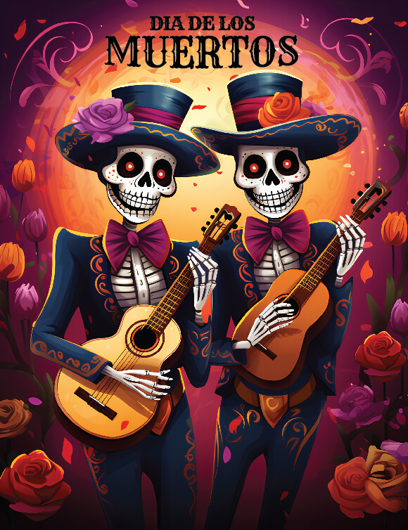 Dia De Los Muertos with Skeleton Playing Guitar and Skeleton Woman