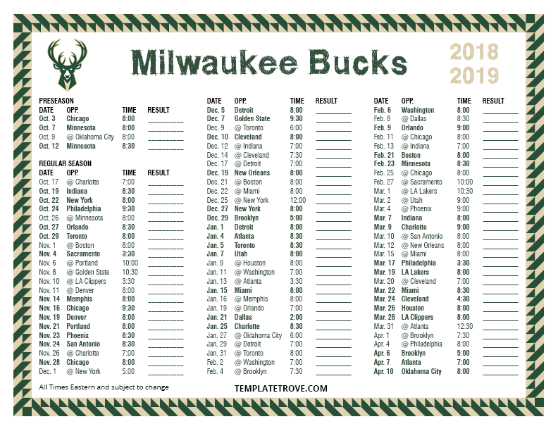 Milwaukee Bucks Printable Schedule