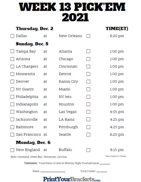 Printable Week 13 Nfl Schedule Printable World Holiday