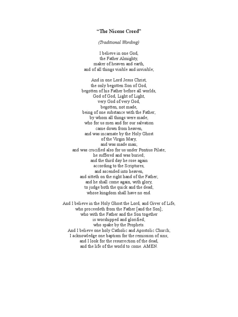 Nicene Creed Printable - We believe in one god, the father, the almighty, maker of heaven and earth, of all that is, seen and unseen. Web the nicene creed is the summary of our catholic faith. God from god, light from light, true god from true god; We believe in one lord, jesus christ, the only son of god, eternally begotten of the father, god from god, light from light, true god from true god, begotten, not made, of one being with the father. Believe in one lord jesus christ, the only begotten son of god, born of the father before all ages. It is the only ecumenical creed because it is accepted as authoritative by the roman catholic, eastern orthodox, anglican, and major protestant churches. All that we teach throughout the year in religious education has a foundation in the nicene creed. Web nicene creed printable, catholic art, catholic print, catholic printable, minimal prayer print, instant download. It is common ground to east orthodox, roman catholics, anglicans, lutherans, calvinists, and many other christian denominations. We believe in one lord jesus christ, the only son of god, eternally begotten of the father; I believe in one god, the father almighty, maker of heaven and earth, of all things visible and invisible. I believe in one lord jesus christ, the only begotten son of god, born of the father before all ages. Web nicene creed, ecumenical christian statement of faith. Web nicene creed i believe in one god, the father almighty, maker of. Web nicene creed or the creed of nicaea is used to refer to the original version adopted at the first council of nicaea (325), to the revised version adopted by the first council of constantinople (381), to the liturgical text used by the eastern orthodox church (with i believe instead of we believe), to the latin version that includes the.. We believe in one lord, jesus christ, the only son of god, eternally begotten of the father, god from god, light from light, true god from true god, begotten, not made, consubstantial of one being with the father. Web the nicene creed is the historic statement of belief of the christian faith devised by the council of nicaea, convened in. Web catholic belief is succinctly expressed in the profession of faith or credo called the nicene creed: Web this is the catholic nicene creed, as used in the roman catholic church's liturgy. [noun] a christian creed expanded from a creed issued by the first nicene council, beginning "i believe in one god," We believe in one lord, jesus christ, the. The nicene creed set forth the key affirmations. Through him all things were made. Prayer digital print set in english. Web the nicene creed is the most widely accepted and used brief statements of the christian faith. Web worship formation & liturgical resources the nicene creed evangelical lutheran worship the nicene creed is appropriate during advent, christmas, easter, and on. We proclaim it every sunday at mass. Web worship formation & liturgical resources the nicene creed evangelical lutheran worship the nicene creed is appropriate during advent, christmas, easter, and on festival days. Web catholic belief is succinctly expressed in the profession of faith or credo called the nicene creed: Prayer digital print set in english. Charles borromeo catholic church, picayune,. Web nicene creed printable, catholic art, catholic print, catholic printable, minimal prayer print, instant download. And used in liturgical worship. It is common ground to east orthodox, roman catholics, anglicans, lutherans, calvinists, and many other christian denominations. I believe in one god, the father almighty, maker of heaven and earth, of all things visible and invisible. We believe in one. It is the only ecumenical creed because it is accepted as authoritative by the roman catholic, eastern orthodox, anglican, and major protestant churches. We believe in one lord, jesus christ, the only son of god, eternally begotten of the father, god from god, light from light, true god from true god, begotten, not made, one in being with the father.. Learn more about the history and importance of the nicene creed. And in one lord jesus christ, the only rbegotten son of god, begotten of his father before all worlds, god of god, light of light, very god of very god, begotten, not made, being of one substance with the father, Web traditional catholic prayers prayers every catholic should know. 325 by the emperor constantine in the city of nicaea, located in what is now northwest turkey. Web the nicene creed, composed in part and adopted at the first council of nicaea(325) and revised with additions by the first council of constantinople(381), is a creedthat summarizes the orthodox faith of the christian church and is used in the liturgyof most. Web nicene creed (professed at sunday mass) we believe in one god, the father, the almighty, maker of heaven and earth, of all that is seen and unseen. [noun] a christian creed expanded from a creed issued by the first nicene council, beginning "i believe in one god," The creed was revised in 381 by the council of constantinople. The nicene creed set forth the key affirmations. Web the nicene creed is the historic statement of belief of the christian faith devised by the council of nicaea, convened in a.d. We believe in one lord, jesus christ, the only son of god, eternally begotten of the father, god from god, light from light, true god from true god, begotten, not made, one in being with the father. Believe in one lord jesus christ, the only begotten son of god, born of the father before all ages. God from god, light from light, true god from true god, begotten, not made, consubstantial with the father; In liturgical churches, it is said every sunday as part of the liturgy. It is common ground to east orthodox, roman catholics, anglicans, lutherans, calvinists, and many other christian denominations. We proclaim it every sunday at mass. And used in liturgical worship. And in one lord, jesus the anointed, the only