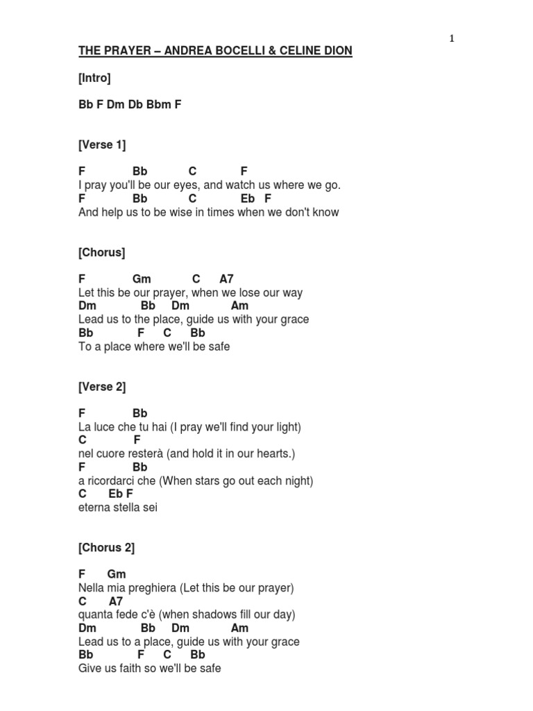 Printable Lyrics To The Prayer In English - When we lose our way. I pray you'll be our eyes. Let this be our prayer. In times when we don’t know. [celine dion:] i pray you'll be our eyes. And help us to be wise. the prayer ( carol bayer sager and david foster) feat. And watch us where we go. Ad #1 in online sheet music downloads. And help us to be wise. Let this be our prayer, when we lose our way lead us to. Let this be our prayer. Shop your favorite songs & artists sheet music now. And help us to be wise. Web [intro] c [verse 1] c f g c i pray you'll be our eyes, and watch us where we go. And help us to be wise, in times when we don't know. C f g c and help us to be wise, in times when we don't know. I pray you'll be our eyes,. [celine dion:] i pray you'll be our eyes. (there are two versions of the lyrics below. Web [intro] bb f dm db bbm f [verse] f bb c f i pray you'll be our eyes, and watch us where we go f bb c eb/f and help us to be wise in times when we don't know. the prayer ( carol bayer sager and david foster) feat. When we lose our way. Let this be our. C f g c and help us to be wise, in times when we don't know. Web the prayer (with lyrics) celine dion and andrea bocelli sing the prayer. Written by david foster, carole bayer sager, alberto testa, and tony renis. And help us to be wise, in times when we don't know. Let this be our prayer, when we. Second the full english version/translation.). And help us to be wise. When we lose our way. (there are two versions of the lyrics below. Lead us to a place. Enjoy our country, english, acoustic version of this beautiful song! C# d# (one step down) e (half step down) f (original key) f# (half step up) g. And help us to be wise, in times when we don't know. And help us to be wise. And watch us where we go. Let this be our prayer, when we lose our way lead us to. Web the prayer (with lyrics) celine dion and andrea bocelli sing the prayer. Written by david foster, carole bayer sager, alberto testa, and tony renis. Web the prayer lyrics • pdf download the prayer lyrics english and italian the prayer lyrics celine and andrea english the prayer. Let this be our prayer. Let this be our prayer. In times when we don't know. And help us to be wise. And help us to be wise. [celine dion:] i pray you'll be our eyes. When we lose our way. I pray you'll be our. Web i pray you’ll be our eyes. And help us to be wise. Web i pray you'll be our eyes. Web imom has over 150 prayers for families. Let this be our prayer, when we lose our way lead us to. I pray you'll be our. Web the prayer lyrics • pdf download the prayer lyrics english and italian the prayer lyrics celine and andrea english the prayer lyrics meaning the prayer. Web click to download pdf. Web the prayer lyrics • pdf download the prayer lyrics english and italian the prayer lyrics celine and andrea english the prayer lyrics meaning the prayer. Web can we touch the soul of heaven can we unite a sacred lesson every child creates a skylight of beauty can you hear cathedrals falling all the universe is calling cry a single. And help us to be wise. Web *as always, this is done for karaoke fun and not for financial gain*i recently sang this solo version of the duet made famous by celine dion and andrea bocel. And help us to be wise. [celine dion:] i pray you'll be our eyes. Web [intro] c [verse 1] c f g c i pray you'll be our eyes, and watch us where we go. And watch us where we go. Ad #1 in online sheet music downloads. Web the prayer i pray you'll be our eyes and watch us where we go and help us to be wise, in times when we don't know. (there are two versions of the lyrics below. Web imom has over 150 prayers for families. Web [intro] bb f dm db bbm f [verse] f bb c f i pray you'll be our eyes, and watch us where we go f bb c eb/f and help us to be wise in times when we don't know. Second the full english version/translation.). Let this be our prayer, when we lose our way lead us to. I pray you'll be our eyes and watch us where we go. And help us to be wise. When we lose our way. Let this be our prayer.The Prayer Chords